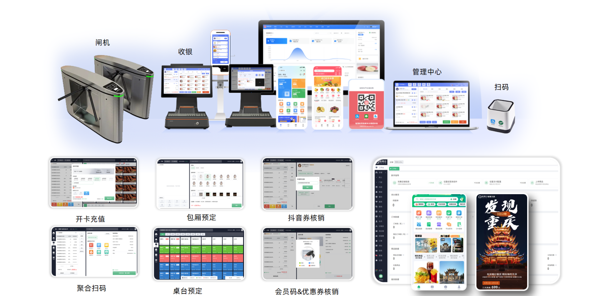 支持多个门店收银、支持门票、 实物、 餐、 房间、 卡五种业态,支持支付宝、 微信、 拉卡拉、 现金、 储值卡等收银